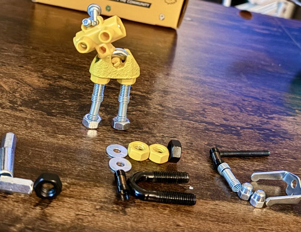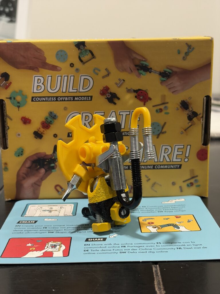 Fun for all ages, TheOffBits imagines play to be creative, educational and multigenerational. Our open-source construction system is based on build-it-yourself kits containing proprietary connectors and standard hardware components. Each kit includes at least one brightly-colored robot character, figurine or vehicle with a unique personality or ability, and a special assembly tool (the SuperTool™ Wrench). Additional parts or materials from your home or office can be upcycled and integrated to add an original twist to your build.