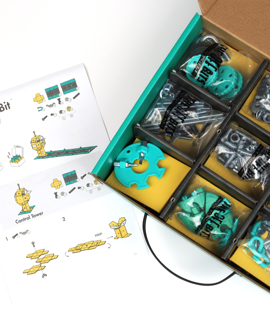 The AirportBit kit includes custom colored nuts and bolts, a detailed instruction booklet, folding packaging for easy storage, unique decals, and over 200 parts.