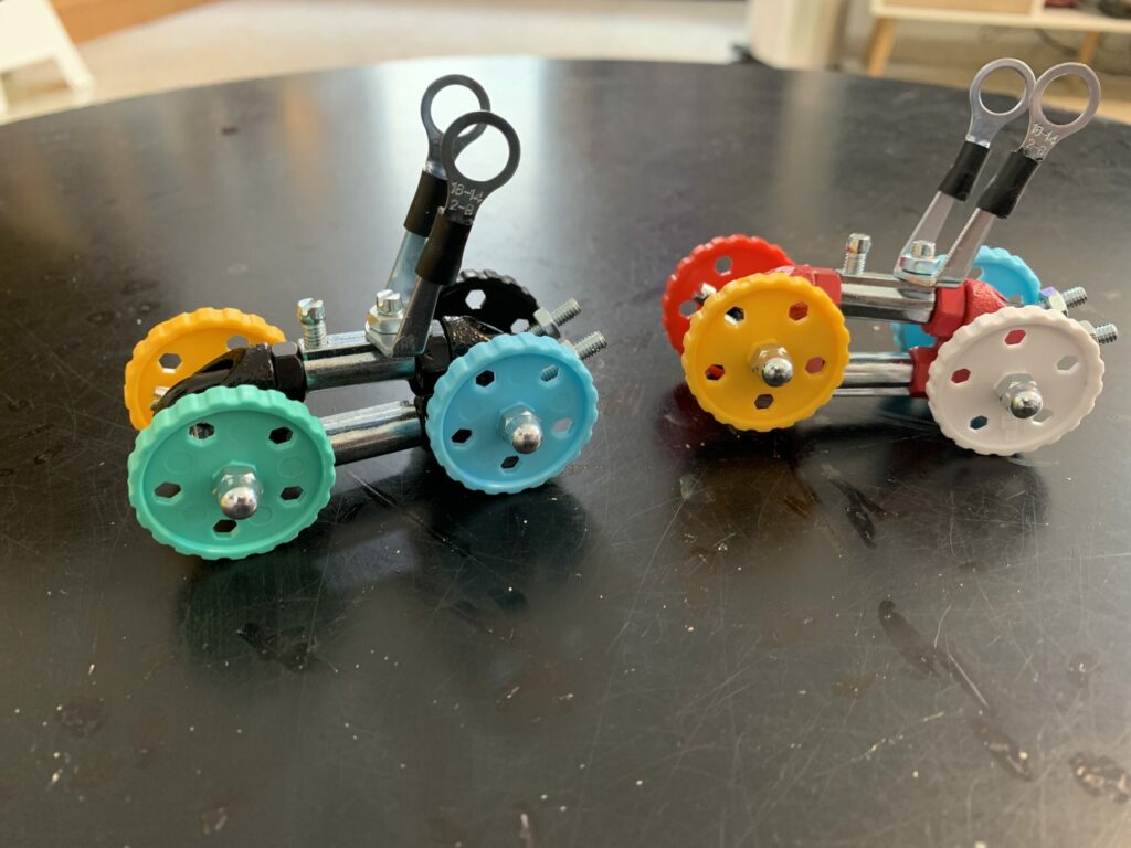 Real metal nuts, bolts, springs, proprietary connectors and colorful plastic parts.