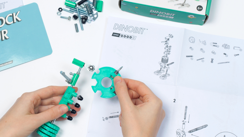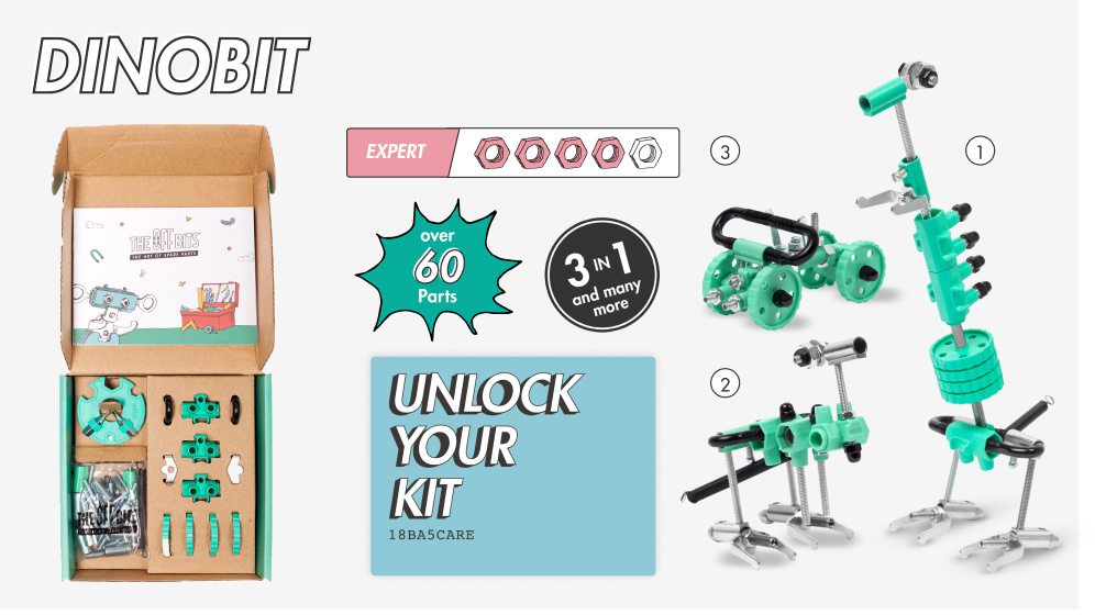 From tail to tooth! DinoBit is a history buff. Featuring an assortment of colorful nuts, bolts and shapely bits, this dinosaur is fiercely loyal.