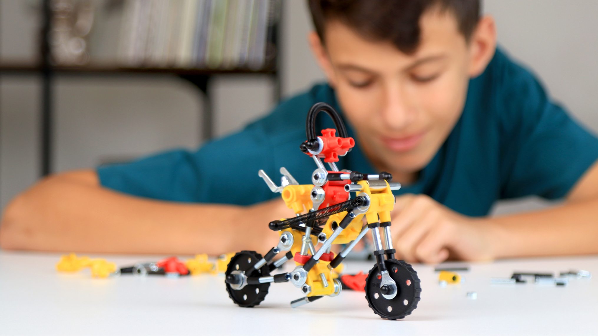 Real metal nuts, bolts, springs, proprietary connectors and colorful plastic parts.